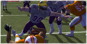 | OLB Jason Pfeifer throws back the Bucs runner |